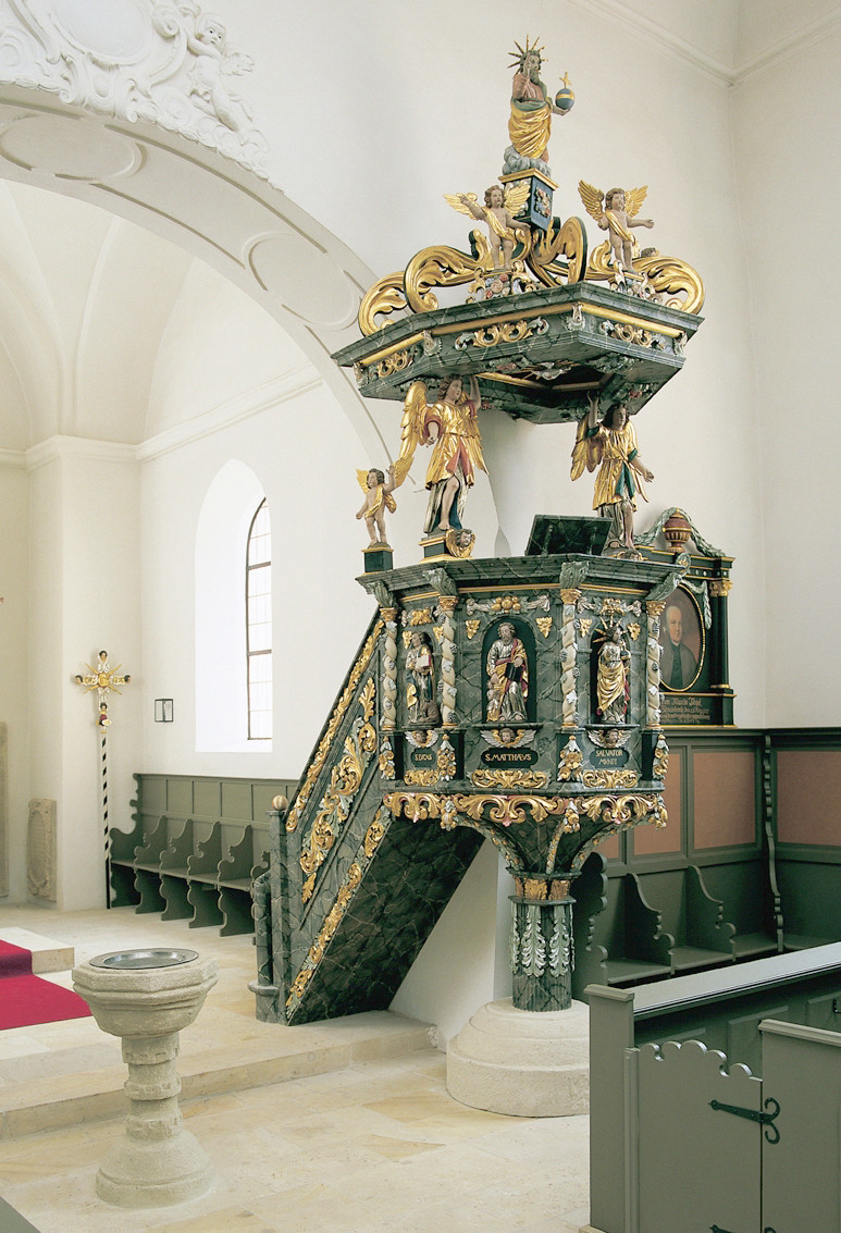 1703 wird die Kanzel von Bernhard Häußler aus Pottenstein erbaut. Dank Gaben viel gutfäliger Herzen.