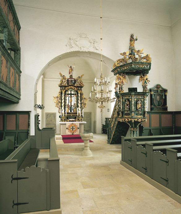 1978 - 1980 Innenrenovierung der Kirche. Der alte Taufstein von 1670 kommt wieder an seinen ursprünglichen Platz.
