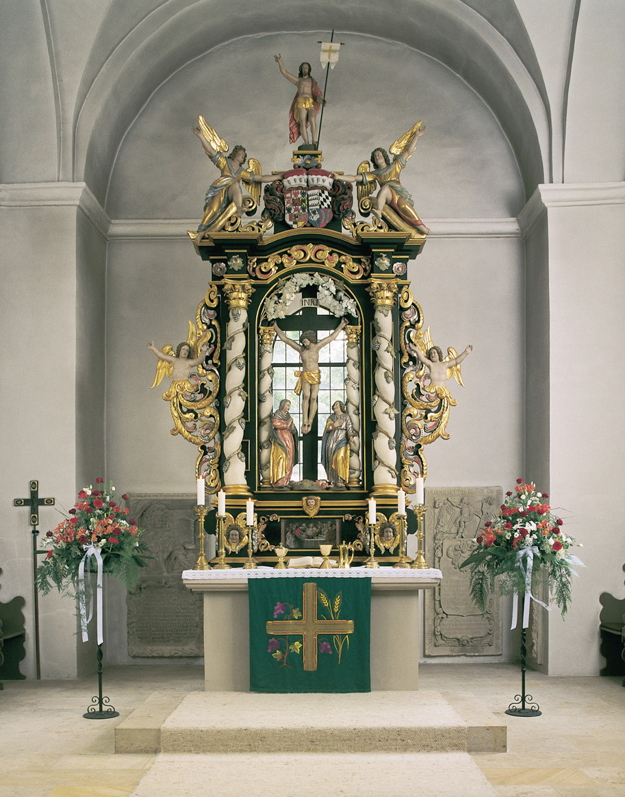 1714 Epitaph hinter dem Altar. Pfarrer Pankraz Sonntag † Pfarrer zu Schnabelwaid von 1701 bis 1714.